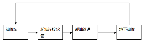 卸油工藝:油罐車行駛至加油站內(nèi)密封卸油口停車處,利用油罐車與地下儲(chǔ)油罐的高位差,采用密閉式卸油。采用油氣回收系統(tǒng),在油罐車卸油過程中,將原來儲(chǔ)油罐內(nèi)散溢的油氣,通過油氣回收地下工藝管線及卸車軟管重新收集至油罐車內(nèi),實(shí)現(xiàn)卸油與油氣等體積置換。其工藝流程如下圖: